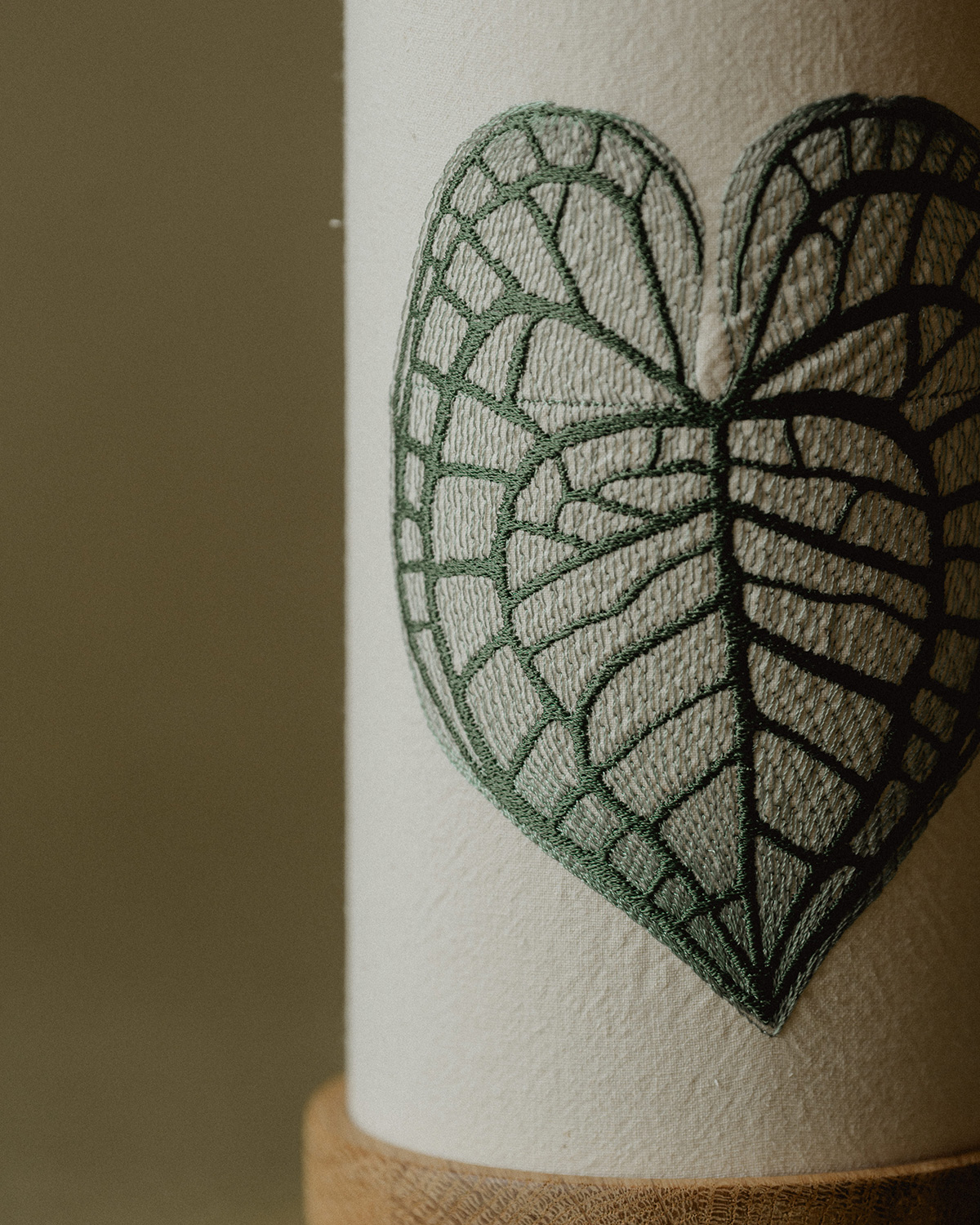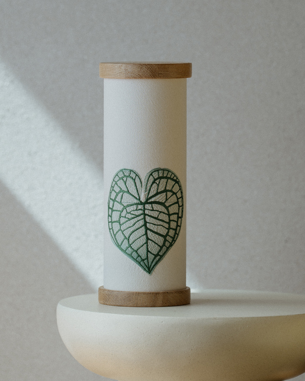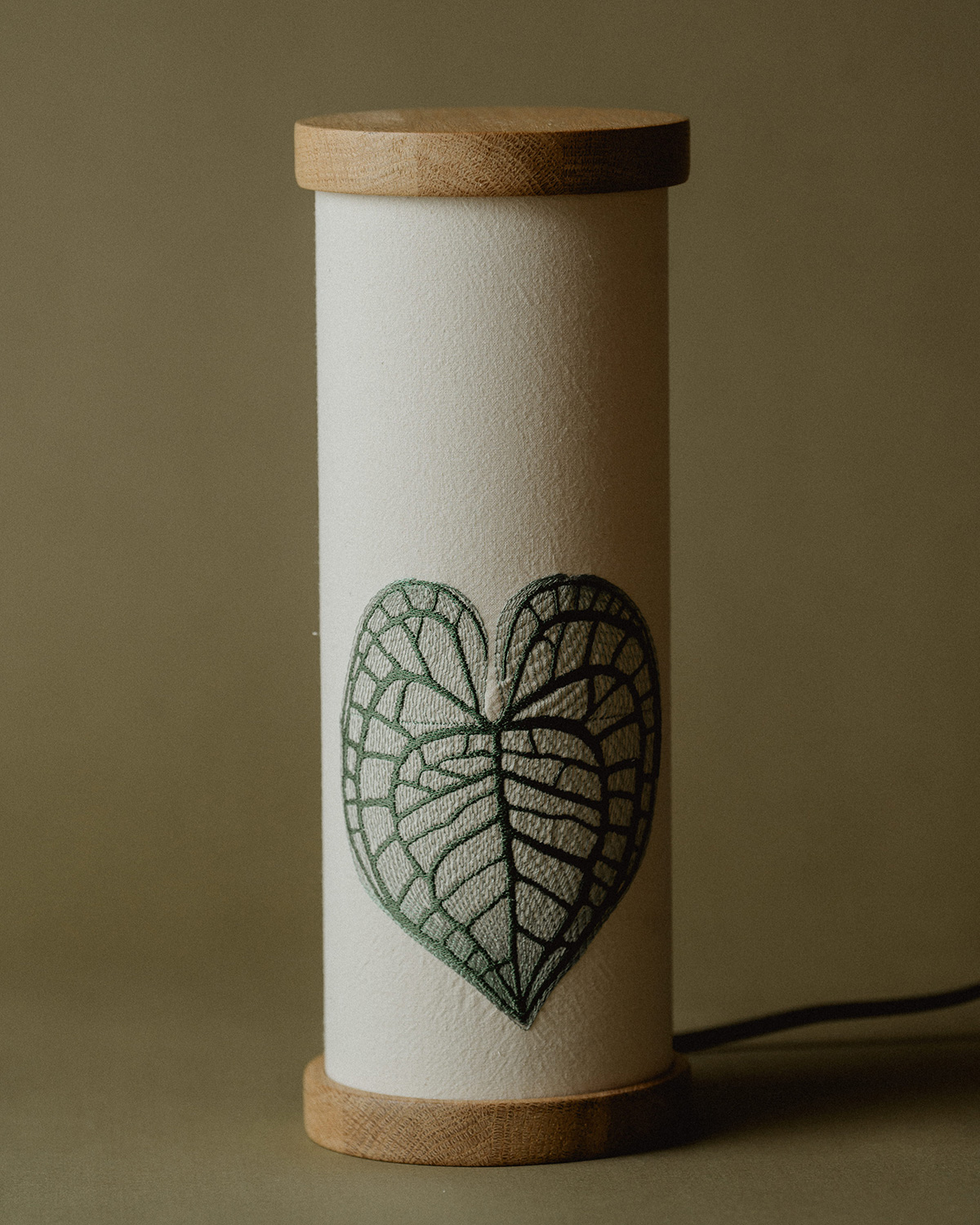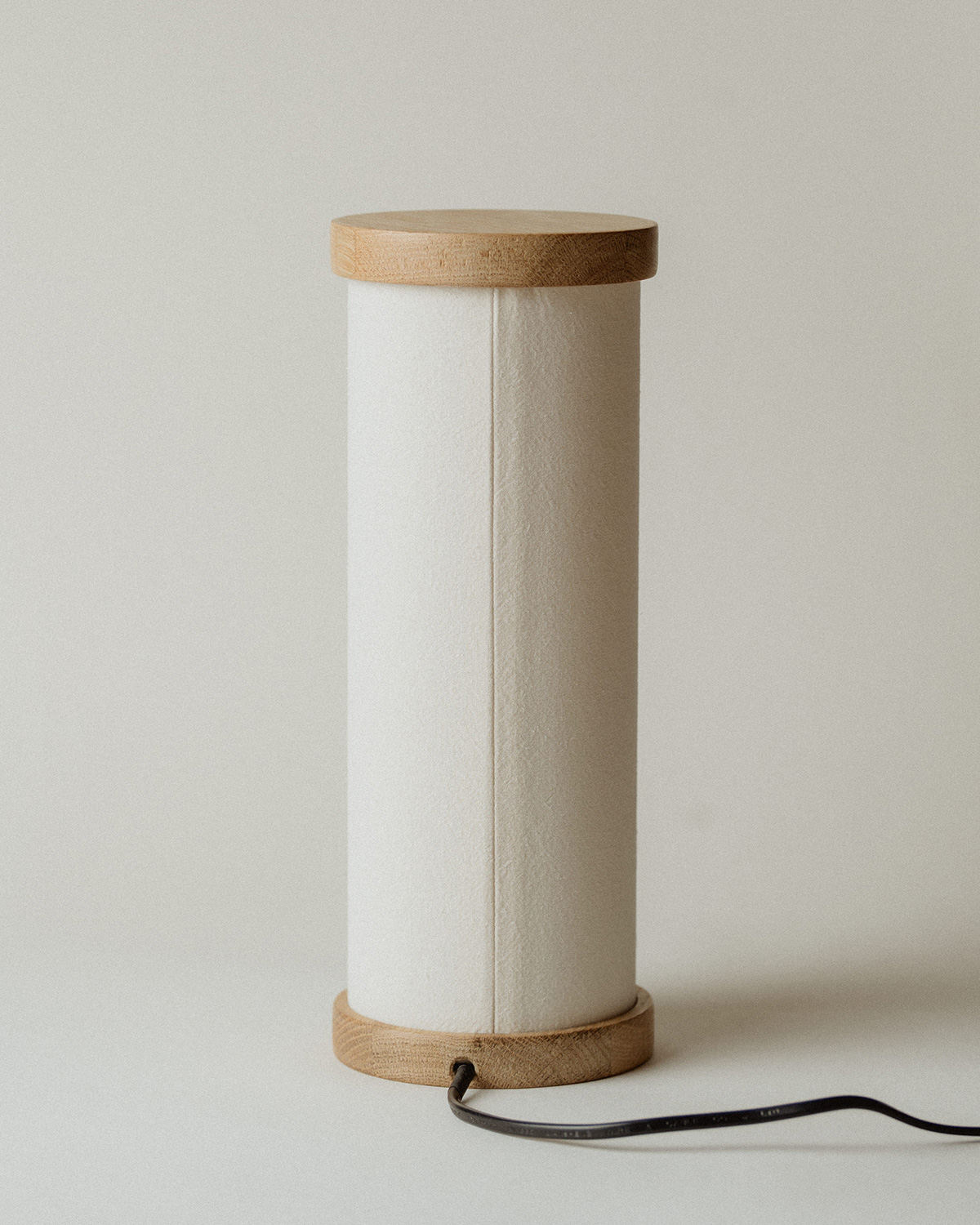 Forma este redusă la esențial: două capace din stejar masiv și un cilindru îmbrăcat în textil brodat. Simplitatea volumului nu este un exercițiu minimalist, ci o alegere intenționată de a lăsa materialele să vorbească. Lemnul, finisat cu ulei danez ecologic, păstrează fibra vizibilă și introduce o notă tactilă autentică. Textilul, dens și bine tensionat, completează ansamblul cu o suprafață calmă.