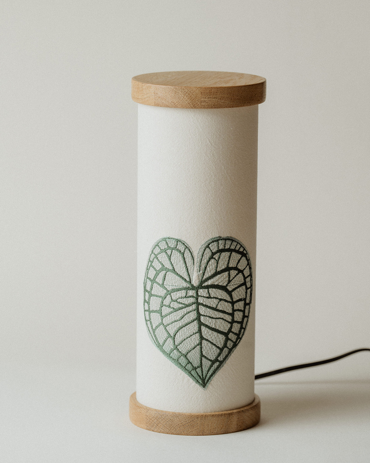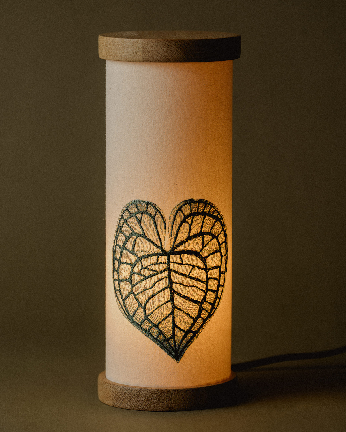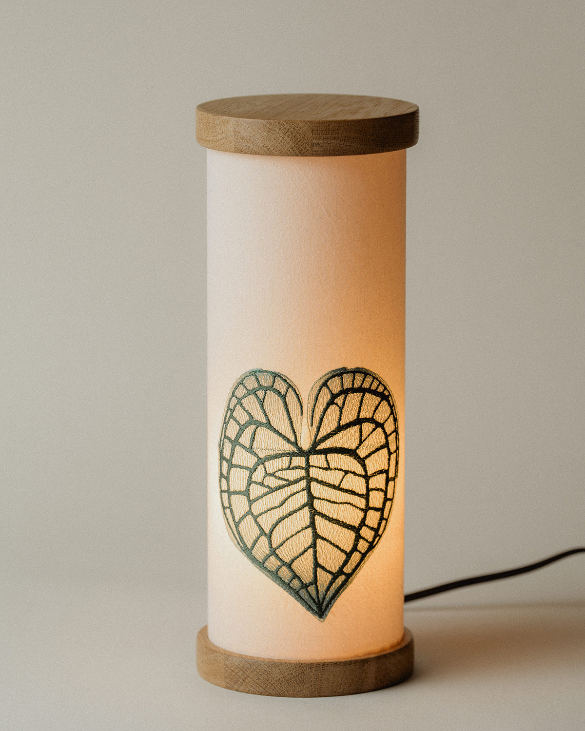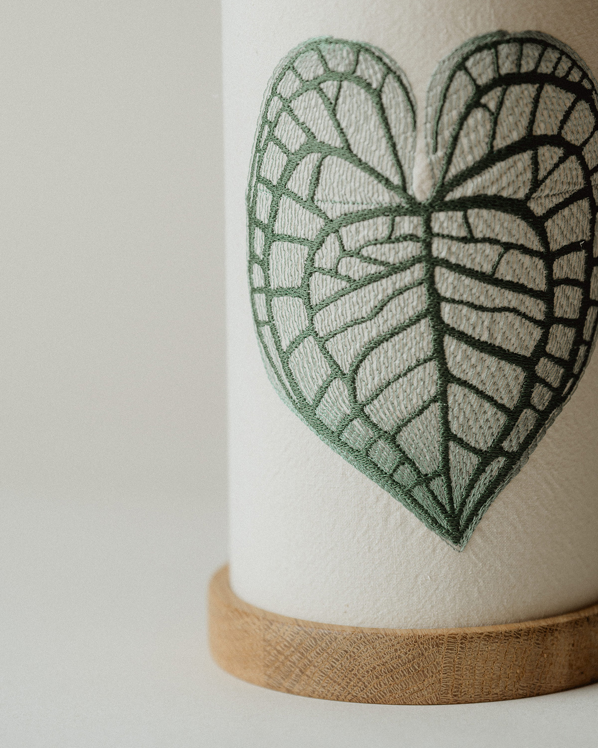 Forma este redusă la esențial: două capace din stejar masiv și un cilindru îmbrăcat în textil brodat. Simplitatea volumului nu este un exercițiu minimalist, ci o alegere intenționată de a lăsa materialele să vorbească. Lemnul, finisat cu ulei danez ecologic, păstrează fibra vizibilă și introduce o notă tactilă autentică. Textilul, dens și bine tensionat, completează ansamblul cu o suprafață calmă.
