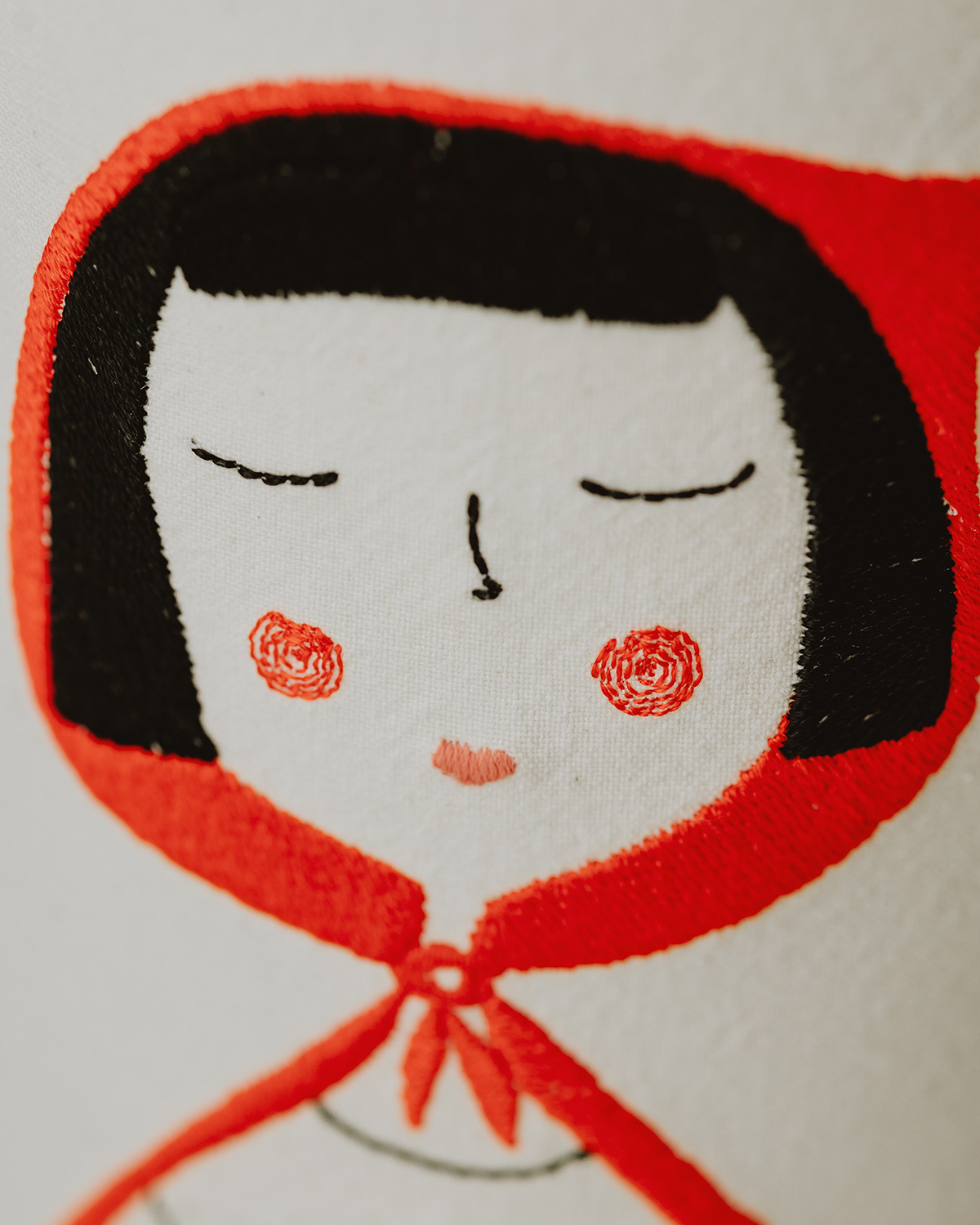 Cilindrul este realizat din pânză de bumbac dens, stabil. Broderia cu Scufița Roșie este executată mecanic, după un desen original creat în atelier. Personajul nu este tratat ca o ilustrație decorativă, ci ca un semn vizual recognoscibil, care introduce o dimensiune narativă discretă în obiect.