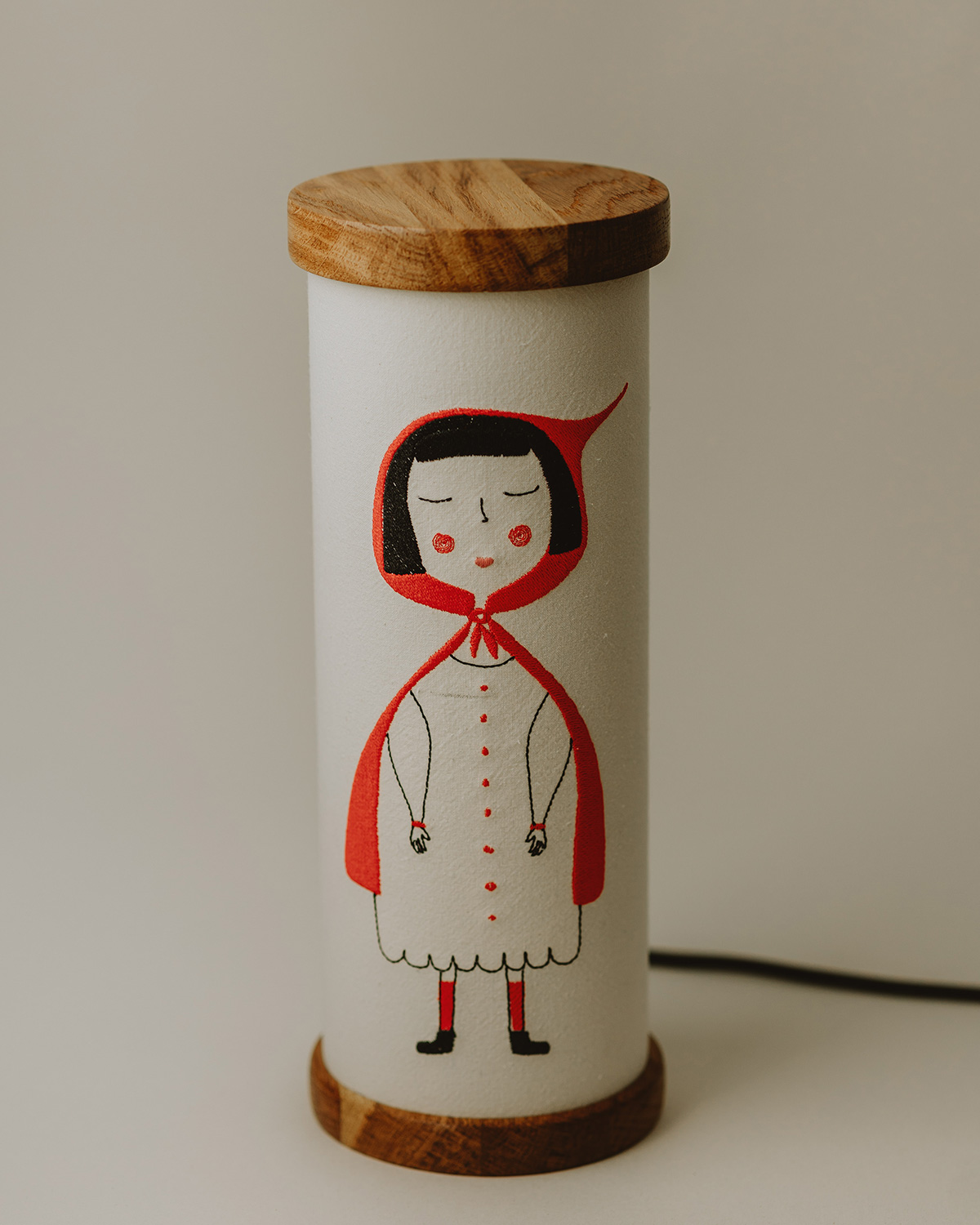 Lampa se leagă vizual și conceptual de figurinele textile Scufița Roșie realizate în atelier, oferind copilului atât o prezență luminoasă, cât și una tactilă, ușor de integrat în joc. Împreună, lămpile și figurinele pot construi un univers coerent în camera copilului, în care personajele există atât ca prezență grafică pe obiecte funcționale, cât și ca obiecte tridimensionale, tactile.