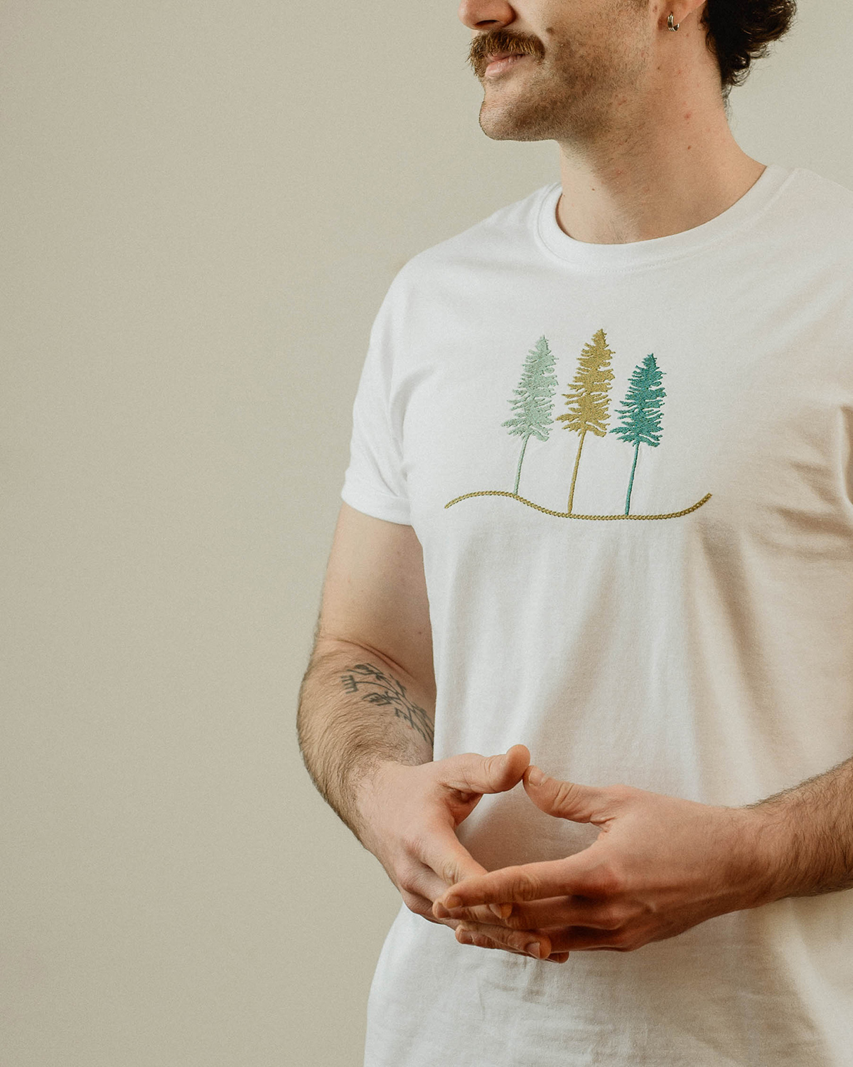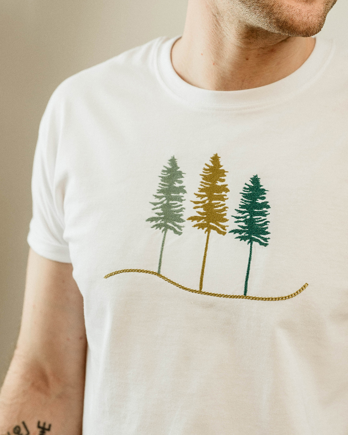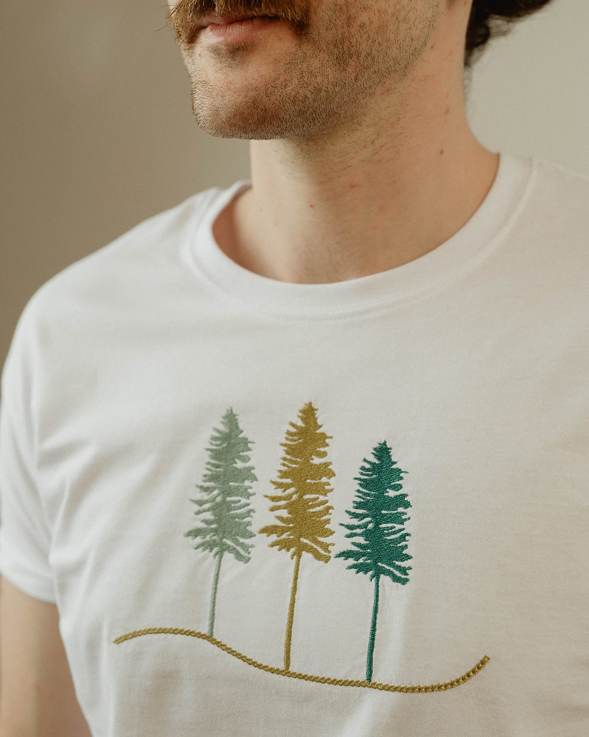 Materialul este bumbac 100%, moale și plăcut pielii. Mânecile sunt cusute cu atenție, iar pe interior, zona broderiei are o căptușeală fină, astfel încât desenul să nu irite și contactul cu pielea să fie cât mai confortabil. Albul țesăturii funcționează ca o bază neutră, scoțând în evidență liniile plantei brodate.