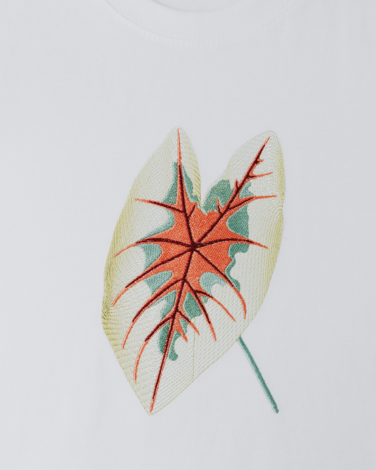 Tricou unisex din bumbac 100%, brodat cu Caladium Rosebud, cu mâneci cusute.