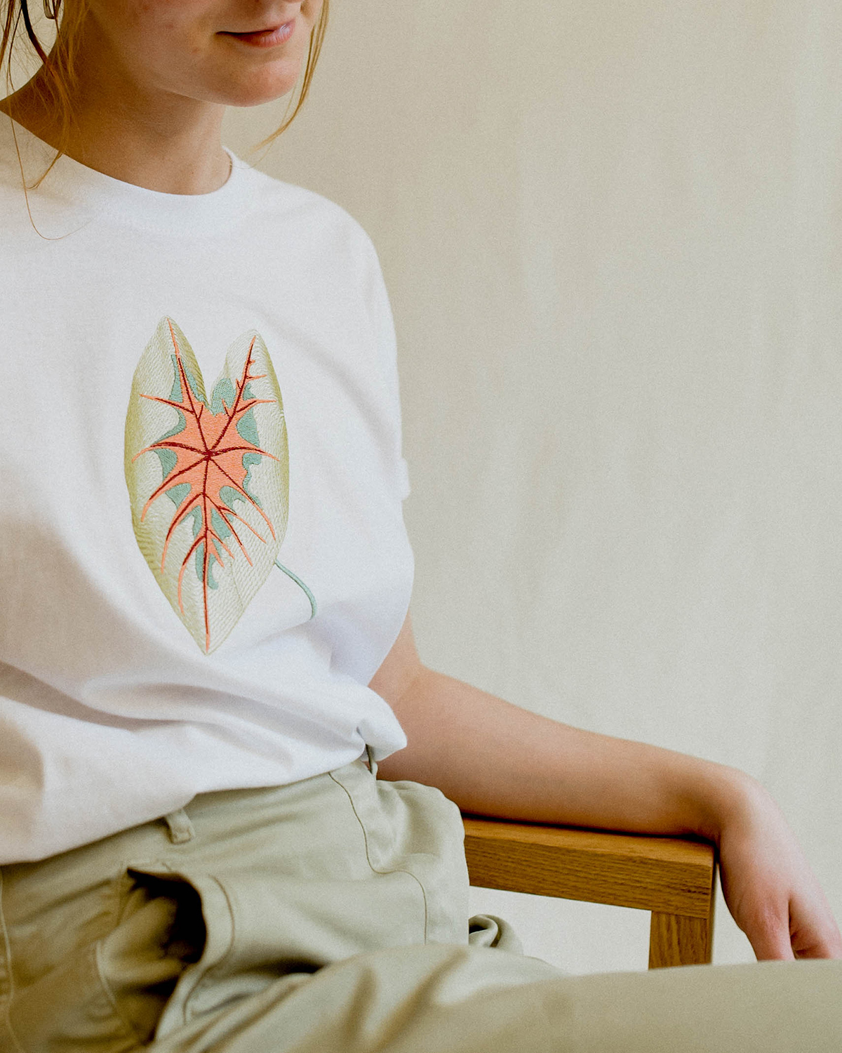 Materialul este bumbac 100%, moale și plăcut pielii. Mânecile sunt cusute cu atenție, iar pe interior, zona broderiei are o căptușeală fină, astfel încât desenul să nu irite și contactul cu pielea să fie cât mai confortabil. Albul țesăturii funcționează ca o bază neutră, scoțând în evidență liniile plantei brodate.