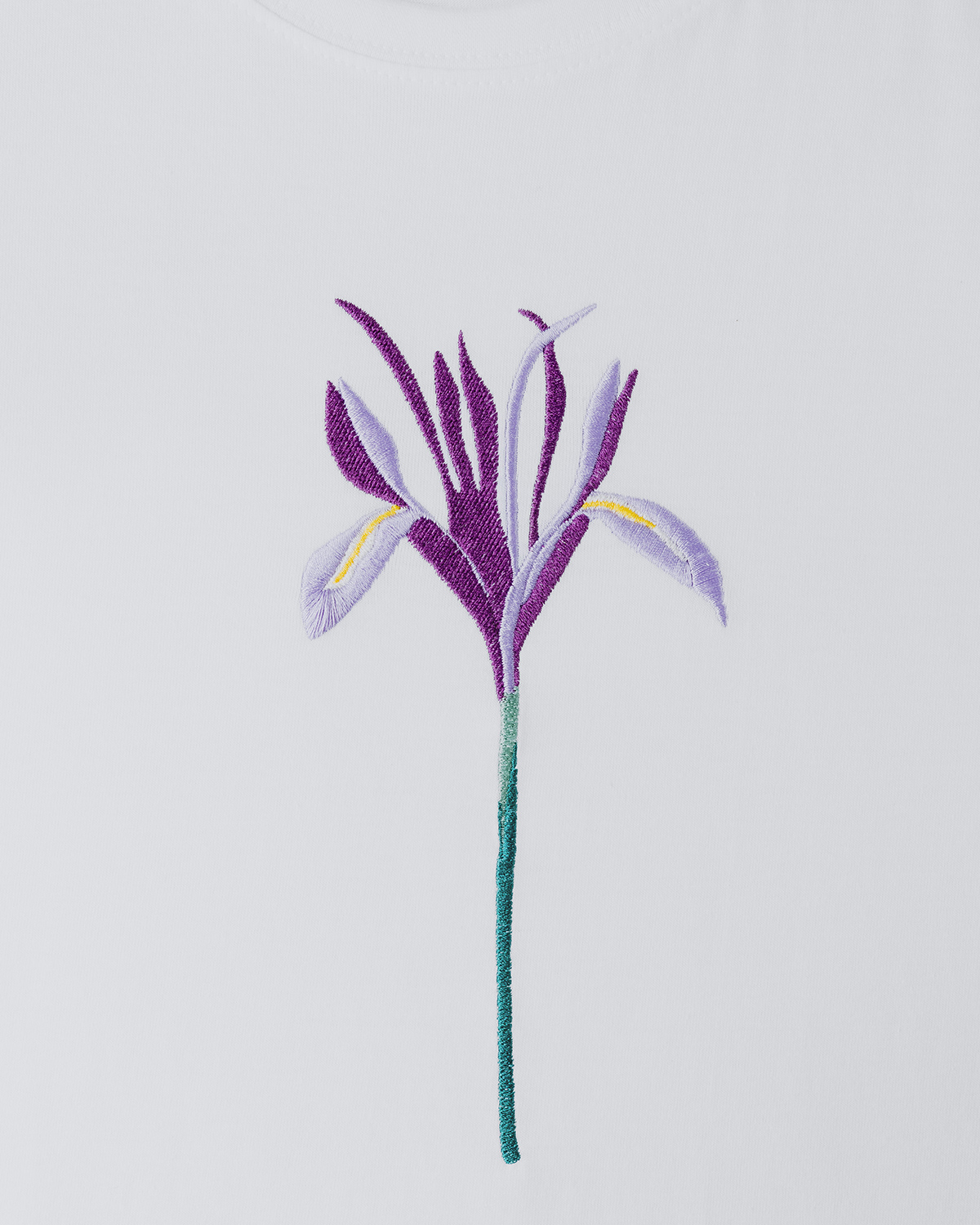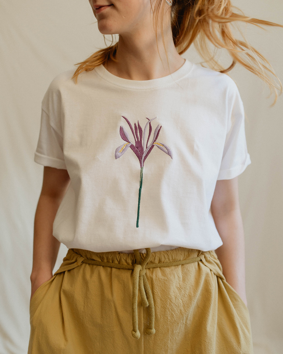 Tricou unisex din bumbac 100%, brodat cu Iris, cu mâneci cusute.