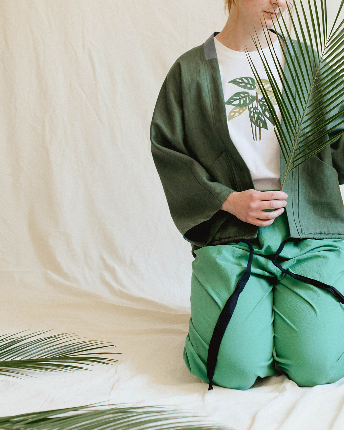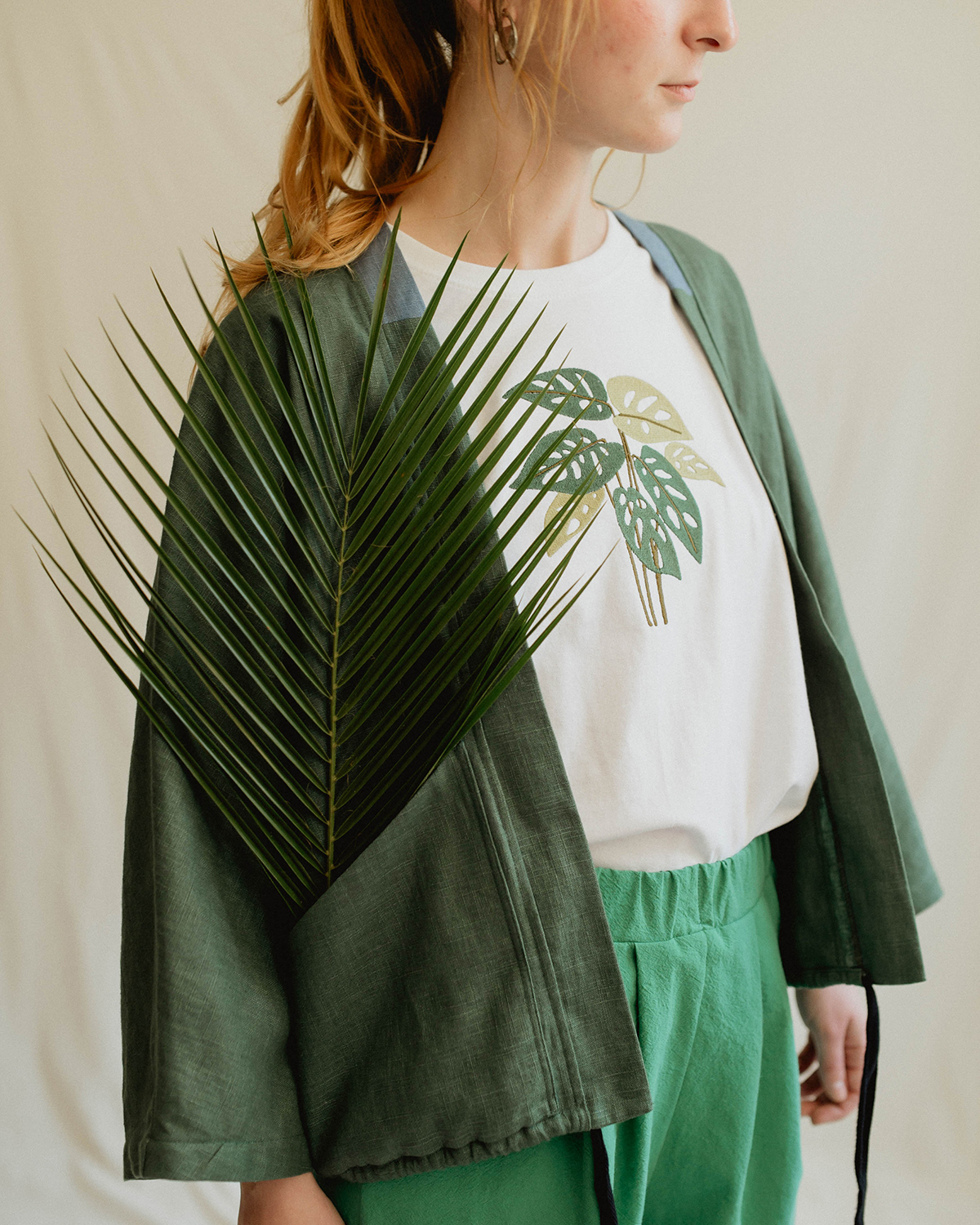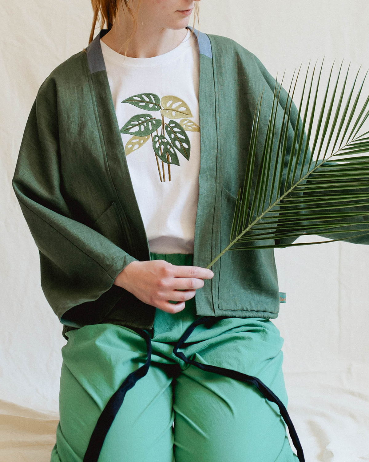 Materialul este bumbac 100%, moale și plăcut pielii. Mânecile sunt cusute cu atenție, iar pe interior, zona broderiei are o căptușeală fină, astfel încât desenul să nu irite și contactul cu pielea să fie cât mai confortabil. Albul țesăturii funcționează ca o bază neutră, scoțând în evidență liniile plantei brodate.