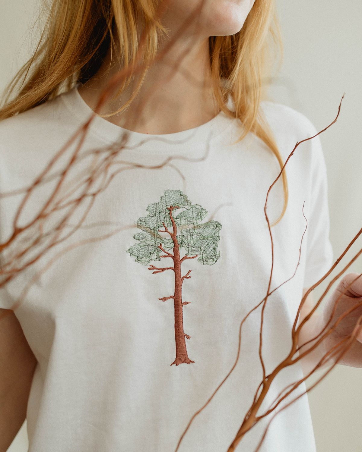 Materialul este bumbac 100%, moale și plăcut pielii. Mânecile sunt cusute cu atenție, iar pe interior, zona broderiei are o căptușeală fină, astfel încât desenul să nu irite și contactul cu pielea să fie cât mai confortabil. Albul țesăturii funcționează ca o bază neutră, scoțând în evidență liniile plantei brodate.